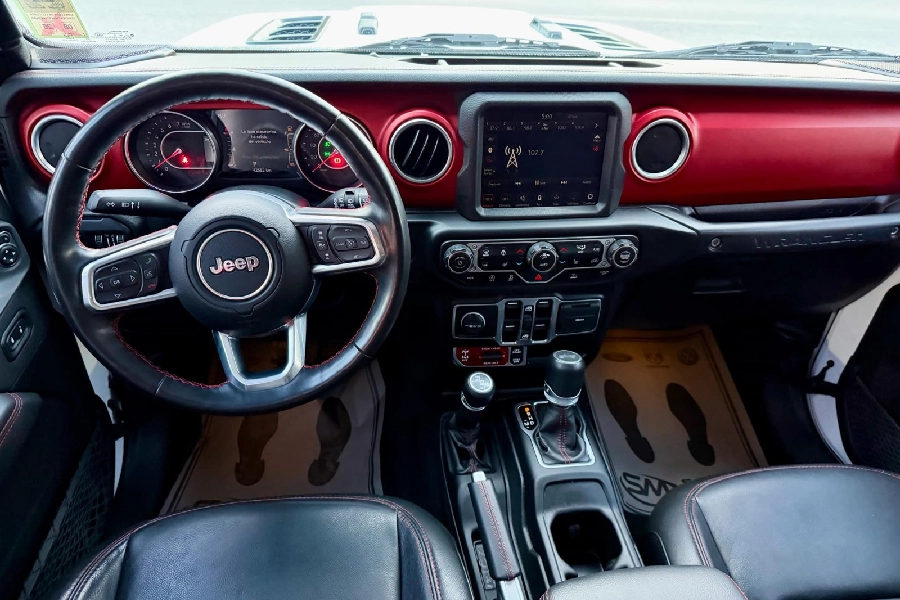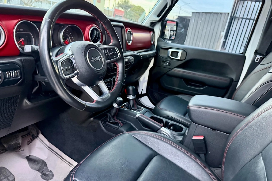 En el interior, la Wrangler Rubicon combina resistencia y confort, ofreciendo una cabina funcional y bien equipada, pensada para soportar cualquier reto sin dejar de lado la comodidad del conductor y los pasajeros. Cada detalle está diseñado para acompañarte tanto en la ciudad como en los terrenos más exigentes.